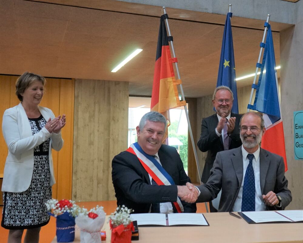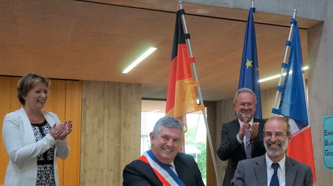 Die Bürgermeister Laurent Favreau und Jürgen Soltau (von links) bei der Vertragsunterschrift, dahinter die Leiter der Komitees Chrystèle Chupeau und Erich Spannenberger.