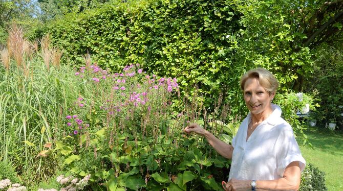 Iris Braun zeigt den derzeit blühenden Kerzenknöterich in Rosa. FOTO: STRAUB
