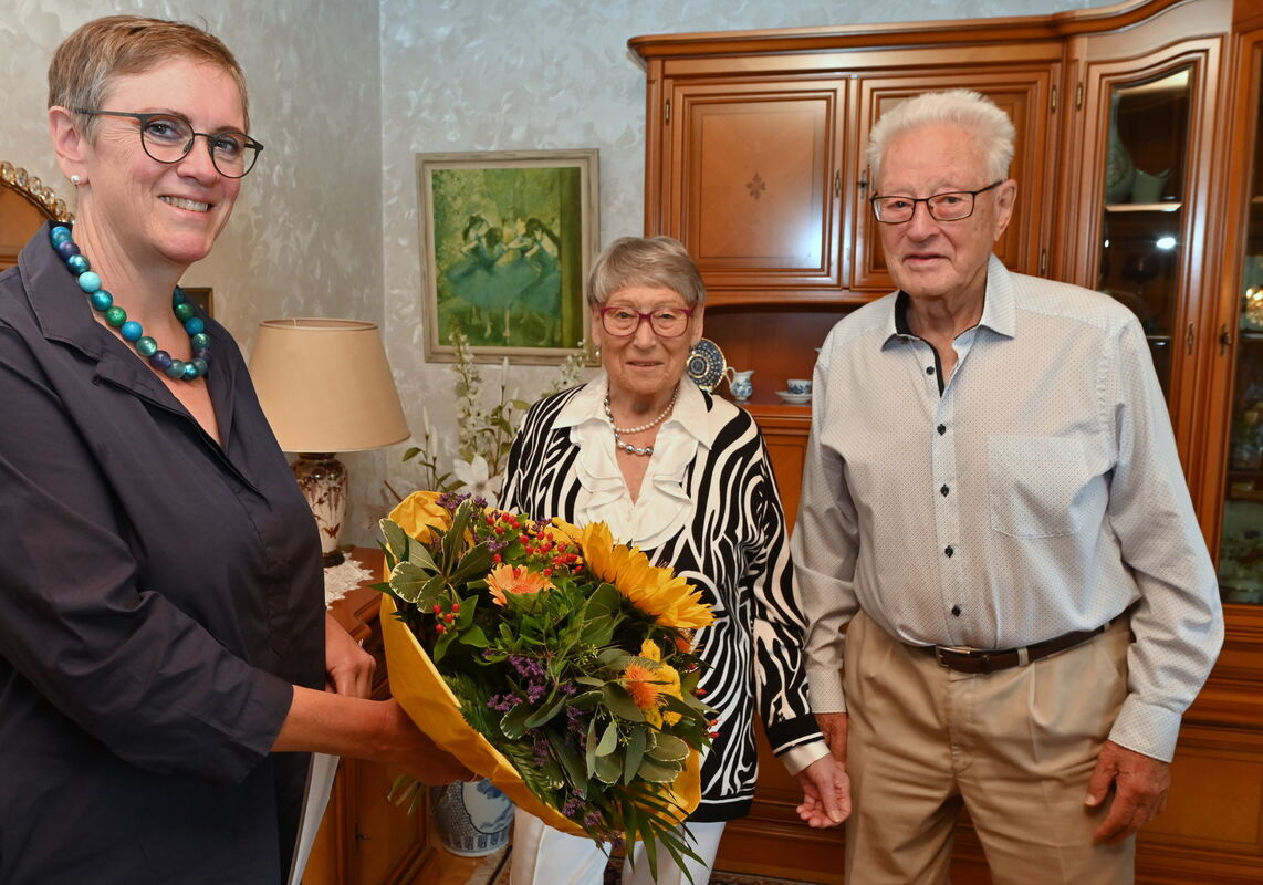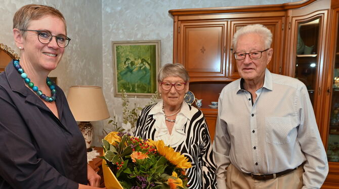 Das Mössinger Jubelpaar Alfred Wilhelm und Margot Würch wird von Barbara Schott (städtische Bürgerschafts-Koordinatorin) beglück