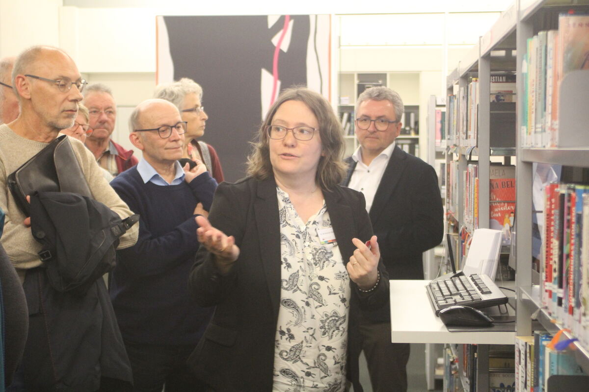 Leiterin Bettina Krimmel-Diem (Bildmitte) führte Vertreter des Gemeinderats und der Stadtverwaltung durch die Mössinger Stadtbücherei.