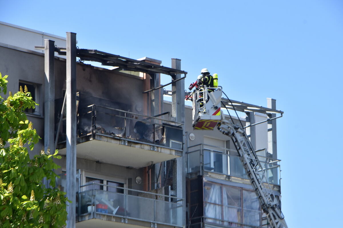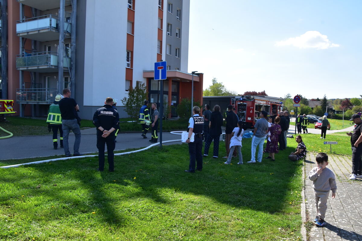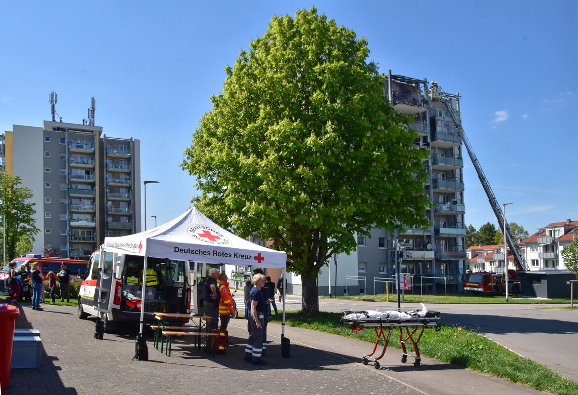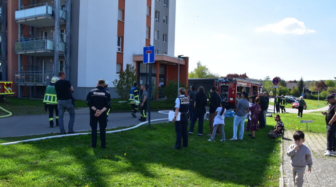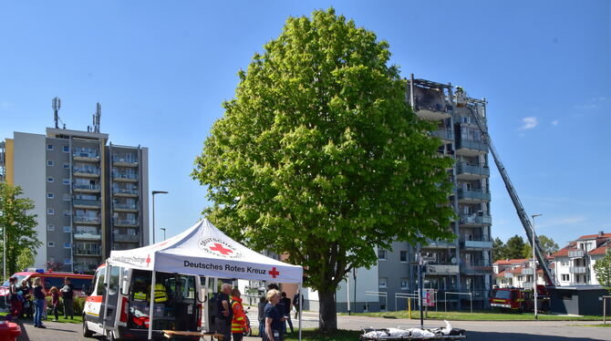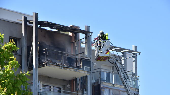 MÖSSINGEN-BÄSTENHARDT. Dramatische Szenen am frühen Montagnachmittag im Stadtteil Bästenhardt. Auf dem Balkon einer Hochhaus-Wohnung im achten Stock schlagen meterhohe Flammen, dunkler Qualm steigt in den wolkenlosen Himmel: Aus noch nicht geklärten Gründen war im Außenbereich der Wohnung ein Feuer ausgebrochen. Schnell war der Löschzug der Feuerwehr Stadtmitte vor Ort, unterstützt von einem Löschfahrzeug aus Belsen.