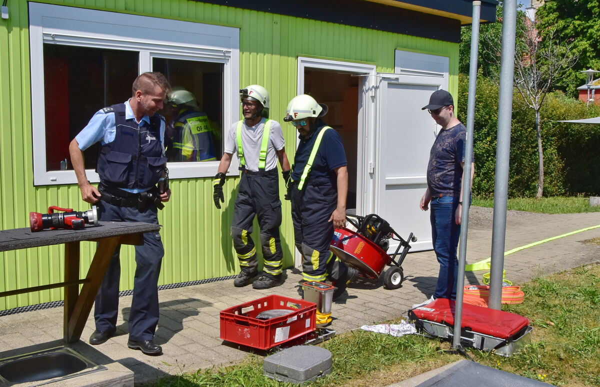 Dort, neben der Kirche, verfolgten die Kleinen an den großen Scheiben gespannt und aufgeregt das Eintreffen und Handeln von Feuerwehr, DRK-Rettungsdienst und Ehrenamtlichen sowie der Polizei. Eine längere Löschleitung wurde gelegt, letztlich aber nicht mehr benötigt. Das Kochfeld wurde ausgebaut und die vom Qualm des verbrannten Kunststoffs erfüllte Räumlichkeit belüftet. »Ich denke, wir haben keinen weiteren Schaden erlitten«, zeigte sich Hauptamtsleiter Alexander Schwarz zuversichtlich. Die in voller Atemschutzmontur eingesetzten Kräfte waren bei 32 Grad völlig nassgeschwitzt, und froh, dass der Einsatz schnell zu Ende war. (GEA)