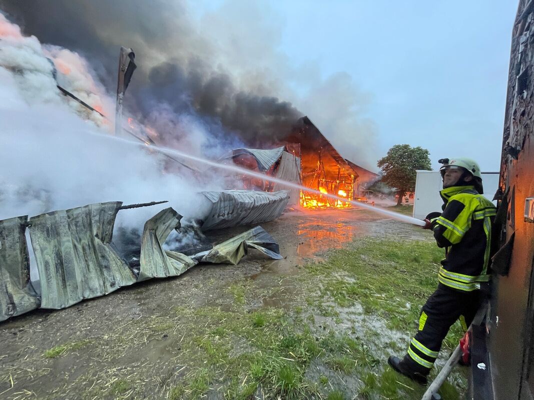Ein Feuerwehrmann beim Großbrand in Ofterdingen im Einsatz.