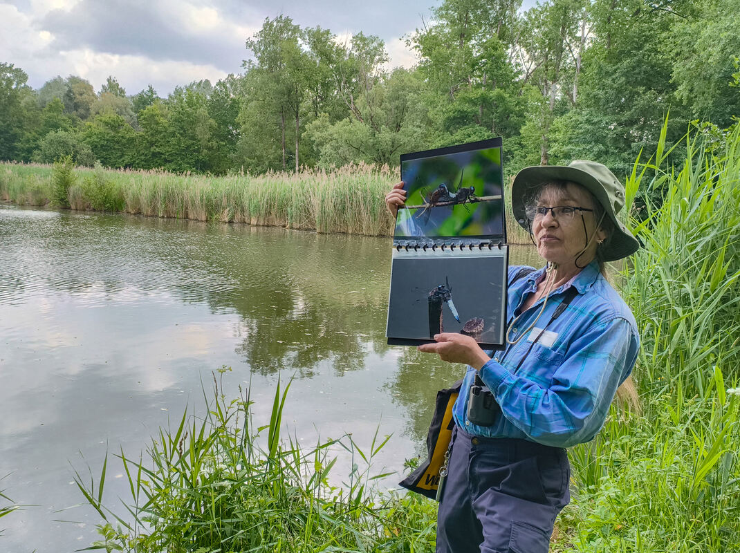 Edelgard Segge-wiße zeigt verschiedene Libellenarten auf Bildern.  FOTO: STRAUB