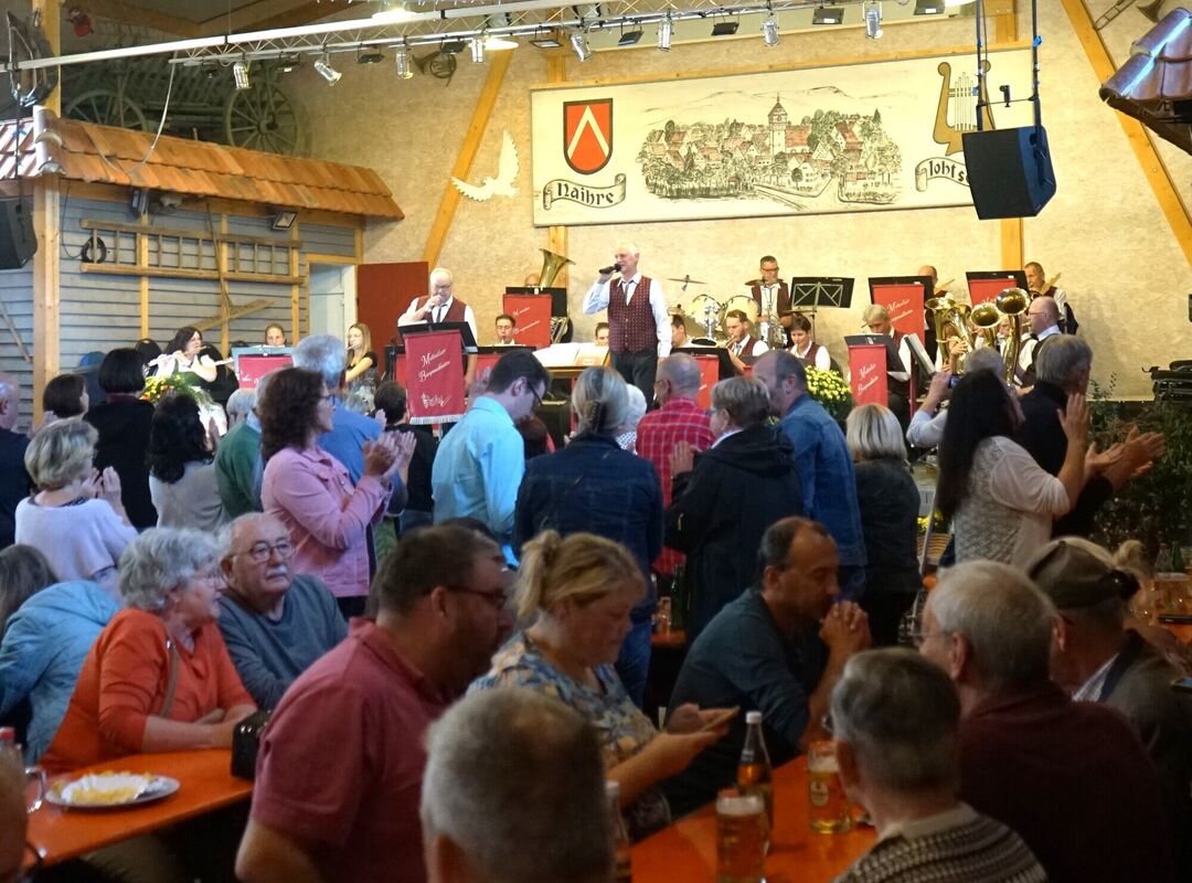 Die Bergmusikanten aus Metzels in Thüringen sorgten am Sonntag in der vollen Nehrener Musikanten- scheune für Stimmung. FOTO: STRAUB