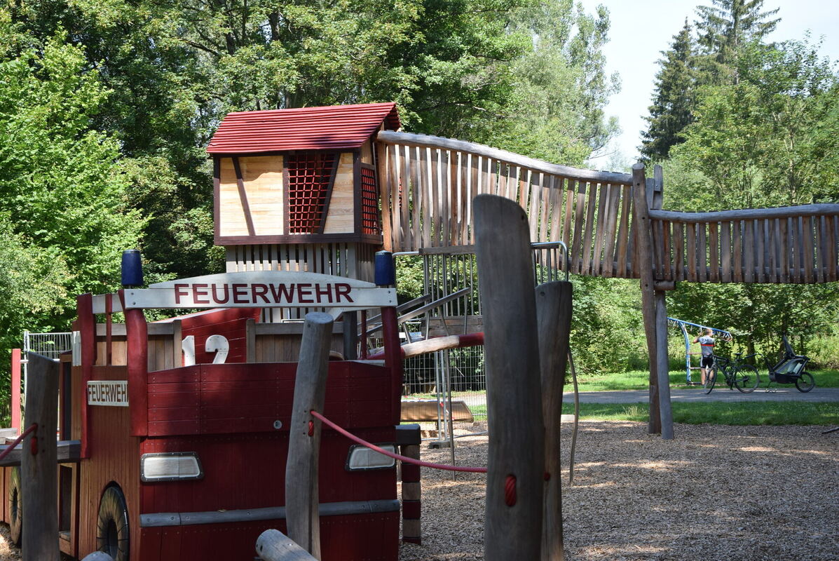 Die sächsische Wespe (auf Lateinisch dolichovespula saxonica) hat sich den Turm der Rutsche auf dem Feuerwehrspielplatz in Tübingen-Lustnau für ihr Nest ausgesucht. Es ist einer der schön gestalteten Spielplätze in der Stadt, wie der Piraten-Spielplatz am Anlagensee oder der viel genutzte im Alten Botanischen Garten. Hier kommen viele Menschen auf dem Weg mit dem Fahrrad nach Bebenhausen vorbei. Der Spielplatz bietet sich für einen Stopp zum Spielen an. Viele Spielgeräte sind im Feuerwehr-Look gestaltet.