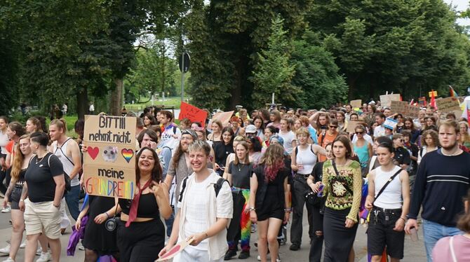TÜBINGEN. Aus Lautsprechern dröhnte Tanzmusik, Regenbogenfahnen wurden geschwenkt. »Bunter Schwabe«, »Mein Gott diskriminiert nicht« und »Gleichberechtigung endet nicht bei unseren Namen«, war auf Plakaten zu lesen. Rund 2.500 Leute versammelten sich am Samstagnachmittag vor dem Uhlandgymnasium in Tübingen, um in einem bunten Demonstrationszug durch die Stadt zu ziehen und sich für die eigenen Rechte einzusetzen. 40 Minuten später als geplant setzte sich der Christopher Street Day (CSD) Tross über die Neckarbrücke und die Mühlstraße hinauf bis zur Uni in Bewegung. Den Alten Botanischen Garten umrundet, ging es durch die Altstadtgassen und über das Lustnauer Tor zurück in Richtung Neckar.
