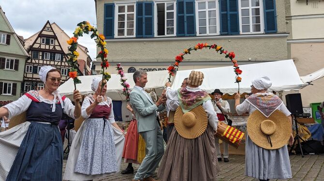 Bei der Eröffnung des umbrisch-provenzalischen Markts gesellte sich OB Palmer zu dem Tanz der Gruppe »Farandoulaire«. FOTO: ZECK
