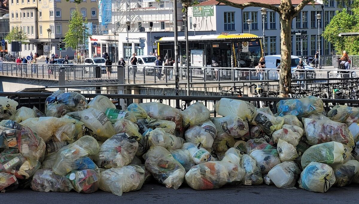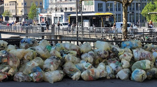 Meterhoch und tagelang stapelten sich die Gelben Säcke. Selbst an der zentralen und belebten Eberhardbrücke in Tübingens Innenstadt.