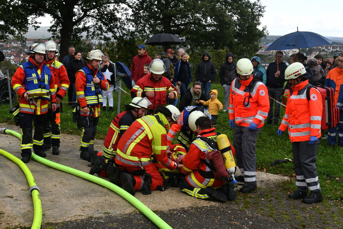 Vorbereitung zum Löschangriff beim Schützenhaus in Gomaringen.