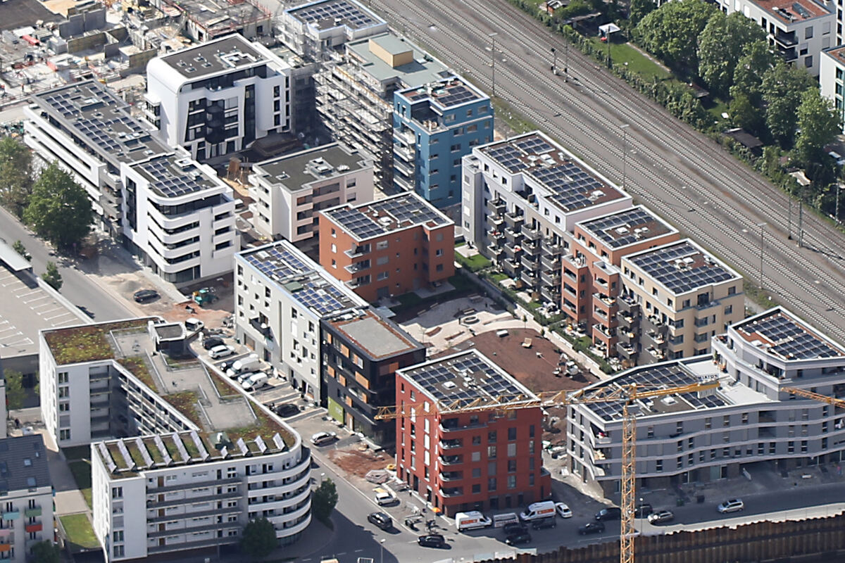 Fotovoltaik auf jedem Dach: Das Areal beim ehemaligen Güterbahnhof in Tübingen gilt als erstes »blaues« Viertel und könnte Vorbild für andere sein. LUFTBILD: GROHE