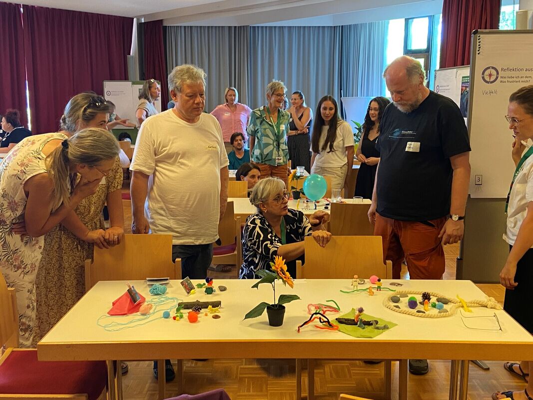 Die Leiterin des Samariterstifts im Tübinger Mühlenviertel, Susanne Gilde (Mitte), deutet zusammen mit ihren Kollegen das abstrakte Diorama, das sie zusammen kreiert haben. Es ist eine künstlerische Interpretation des Ist-Zustands in der Pflege.
