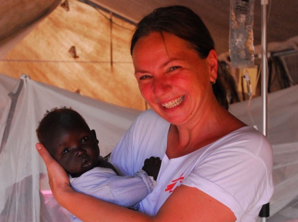 Sabine Dorn mit dem gesunden Baby einer Mutter mit Hepatitis E auf dem Arm. FOTO: ÄRZTE OHNE GRENZEN