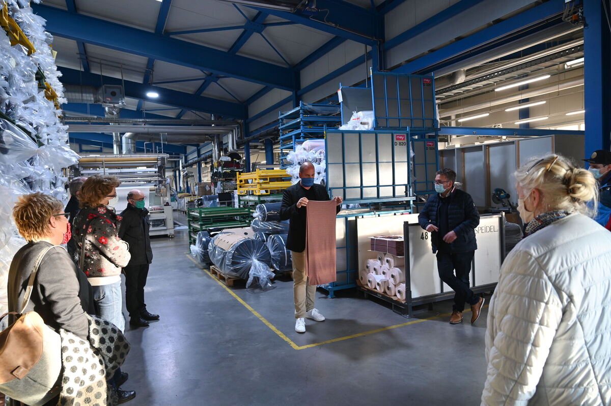 Aus so genannter Schlauchware lassen sich nahtfreie Shirts produzieren, demonstriert Geschäftsführer Christian Weiß den Ortschafts- und Gemeinderäten. FOTO: EBER