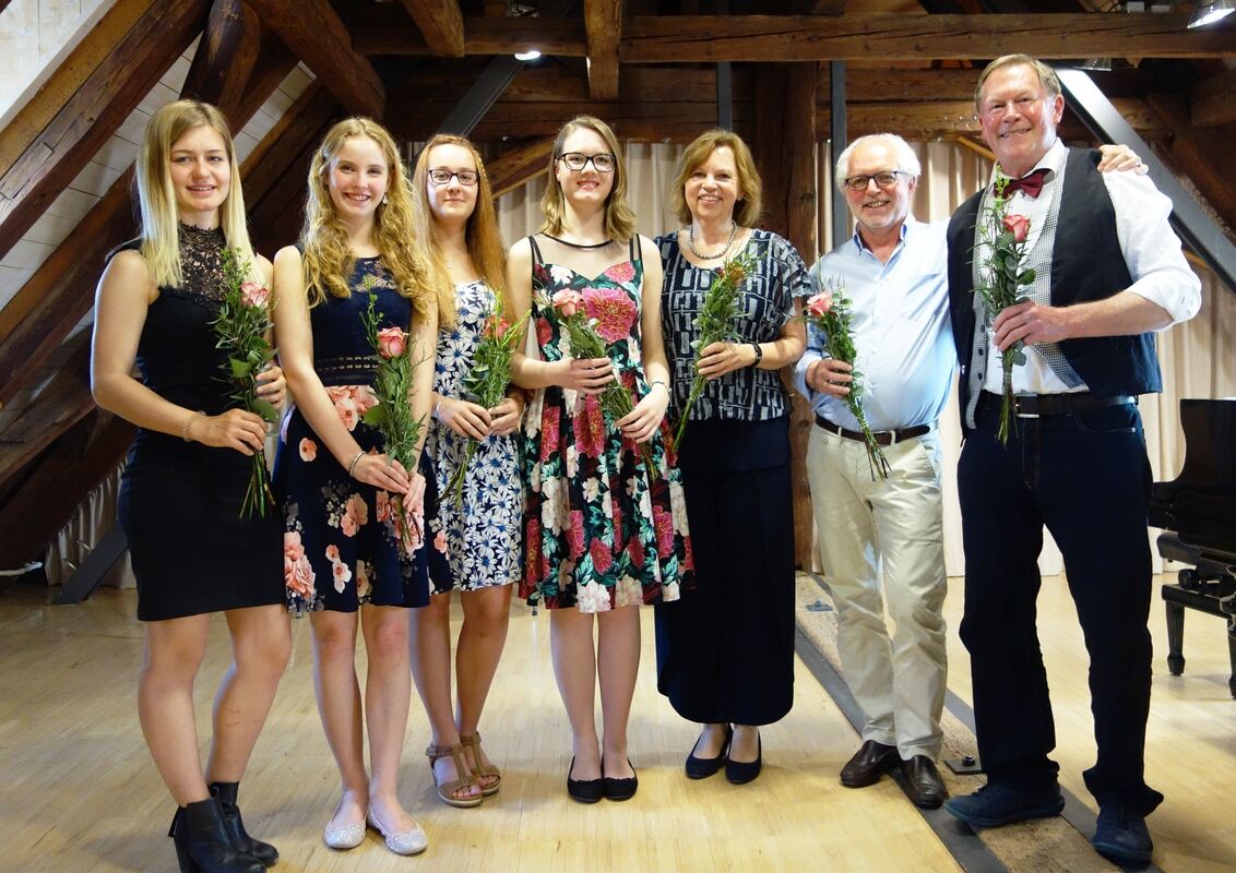 Die passende Musik zur Gustav-Schwab-Lesung im Gomaringer Schloss lieferten die Sängerinnen Felicitas Fraidel, Franzsika Wagner, Anne Heller und Nathalie Usenbenz von der Jugendmusikschule Steinlach, begleitet von Pianistin Beate Pommranz. Philipp Förder und Jürgen Hirning (von links) berichteten aus dem Leben des Pfarrers und Literaten. FOTO: STRAUB