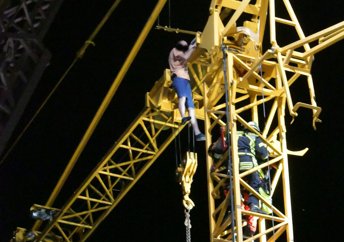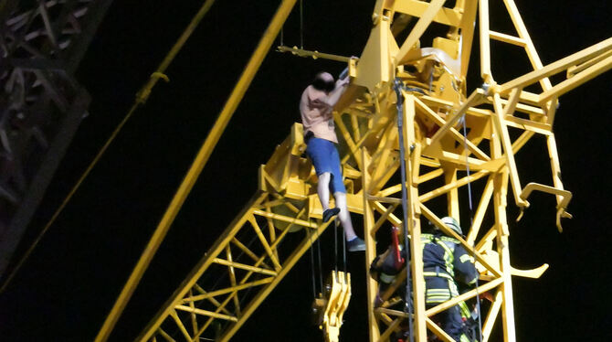 Spektakulärer Rettungseinsatz in der Nacht zum Sonntag in der Stadtmitte von Mössingen. Ein Mann war in der Bahnhofstraße auf den Ausleger eines etwa vierzig Meter hohen Baukran geklettert. Die Feuerwehr beendete den waghalsigen Ausflug.