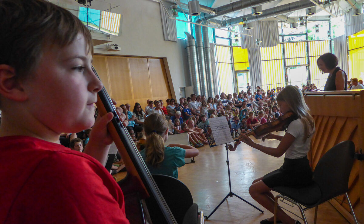Zunächst »übers Hören kennenlernen«, so Schulleiter Wolfgang Schnitzer, sollten die höchst aufmerksamen und neugierigen Kinder die Welt der Musik. Ein erster Beitrag mit dem Kinderchor und Klavierbegleitung sowie dem Papageno-Motiv der Piccoloflöte gab einen Vorgeschmack auf Mozarts »Zauberflöte«, die dieses Schuljahr in einer Bearbeitung einstudiert wird. Ein Streichtrio und das Kontrabass-Duo von Raik Jürgens und seinem Lehrer Steffen Hollenweger mit dem »Fluch der Karibik« gingen den Bläsern mit Rossini und eher Jazzigem voran, wobei neben Trompete, Tuba und Hörner auch das eher seltene Euphonium vorgestellt wurde. Ein Zwischenspiel lieferten die Gitarren. Blockflöten, Fagotte und Klarinette vertraten die Instrumentengruppe der Holzblasinstrumente, und schließlich zeigte ein virtuoses Schlagzeuger-Trio die Möglichkeiten von Marimbafon und Vibrafon.