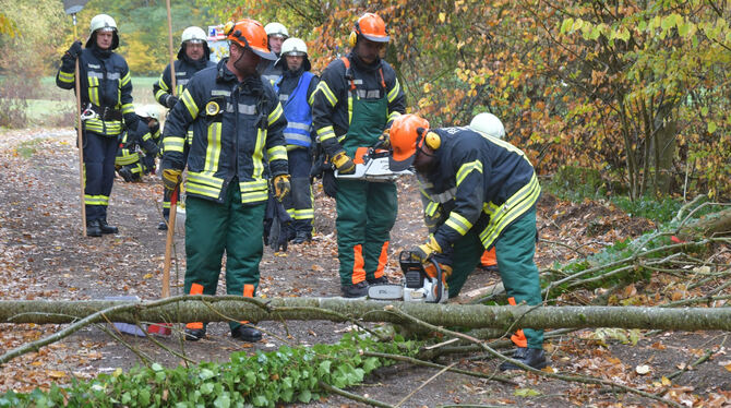Sieben Feuerwehren und das Rote Kreuz proben auf den Härten die Bekämpfung eines Waldbrandes