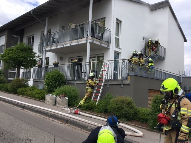 Mit Hilfe einer Steckleiter überwanden die Feuerwehrleute die Mauer und einen Zaun, um in den verrauchten oberen Trakt zu gelangen.