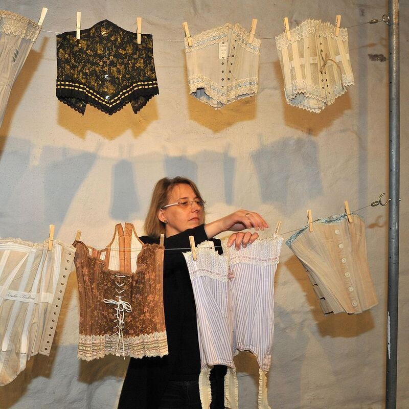 Als Frauen noch »Schnürleib« trugen: Dagmar Waizenegger hängt Ausstellungs-Stücke aus Gomaringen auf die Leine. FOTO: NIETHAMMER