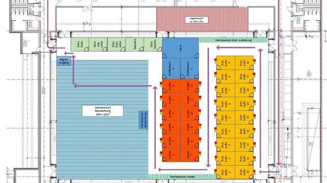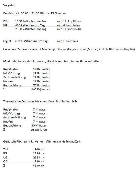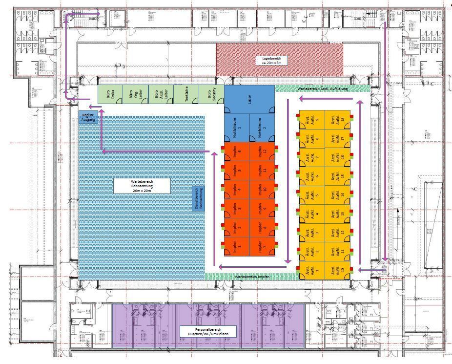 Das Konzept hat auch eine ausreichende medizinische Notfallversorgung berücksichtigt. Im abschließenden Wartebereich sind zwei medizinische Fachkräfte für die Patienten-Beobachtung nach der Impfung zuständig. Sollte es zu größeren Komplikationen kommen gibt es zusätzlich auch noch zwei Notfallräume. Die genutzte Fläche (Eingangszelt, EG, OG und UG) beträgt 4 330 Quadratmeter.