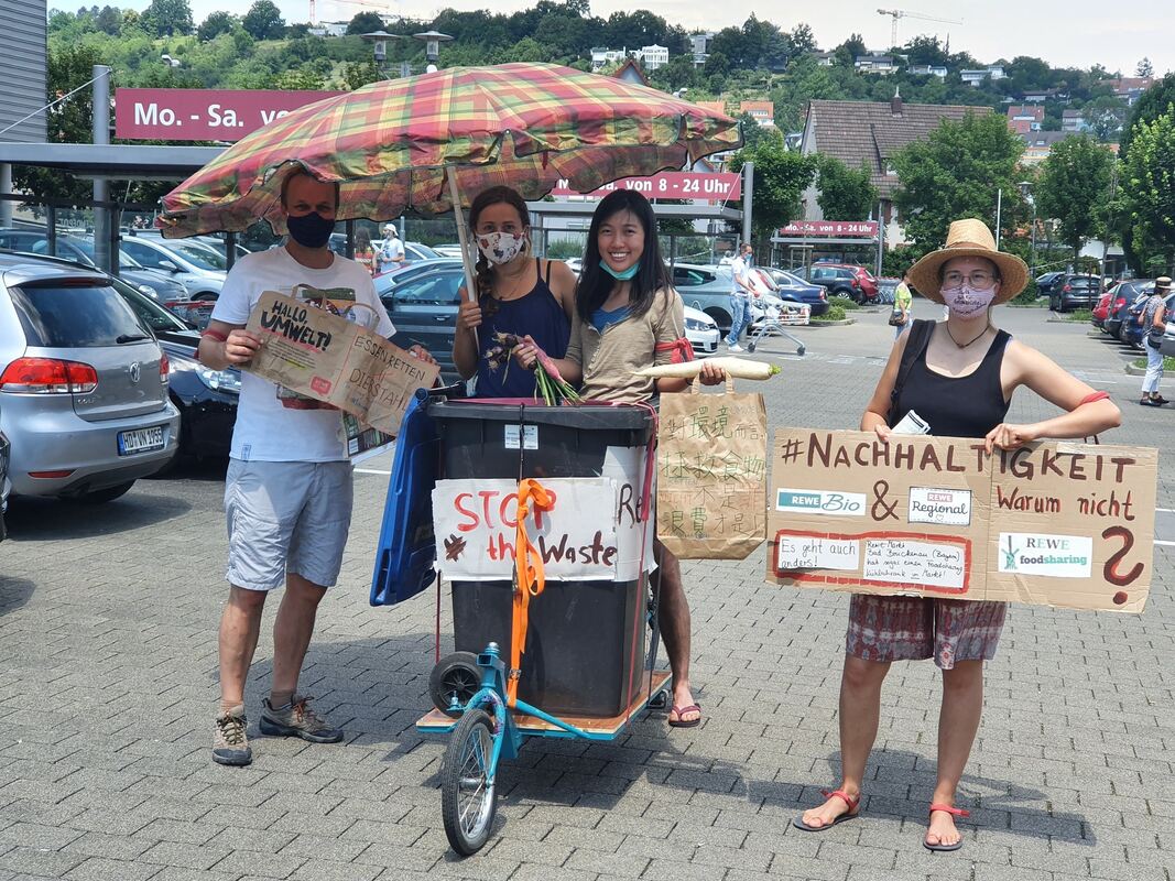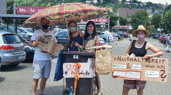 Ferner protestierten die Teilnehmer gegen die Lebensmittelverschwendung und forderten den Filialleiter des Rewe Weststadt auf, die Anzeige gegen die beiden Studenten fallen zu lassen. (GEA)
