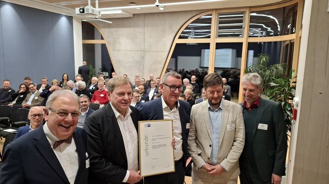 Feierten die Erfolgsgeschichte der Technologieförderung Reutlingen-Tübingen (von links): Reutlingens Oberbürgermeister Thomas Keck, IHK-Hauptgeschäftsführer Dr. Wolfgang Epp (mit Jubiläumsurkunde), die TF R-T-Geschäftsführer Peter Wilke und Thorsten Flink sowie Tübingens Oberbürgermeister Boris Palmer.