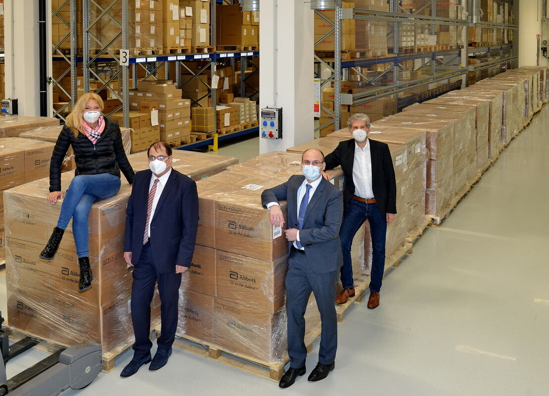 Lieferung eingetroffen und bereit (von links): Die Pandemie-Beauftragte Lisa Federle, Lothar und Markus Horn und Oberbürgermeister Boris Palmer mit einem Teil der 36 Paletten. Aus aktuellem Anlass versichern sie: »Alles völlig uneigennützig. Bei dieser Aktion verdient keiner von uns auch nur einen Cent.« FOTO: NIETHAMMER
