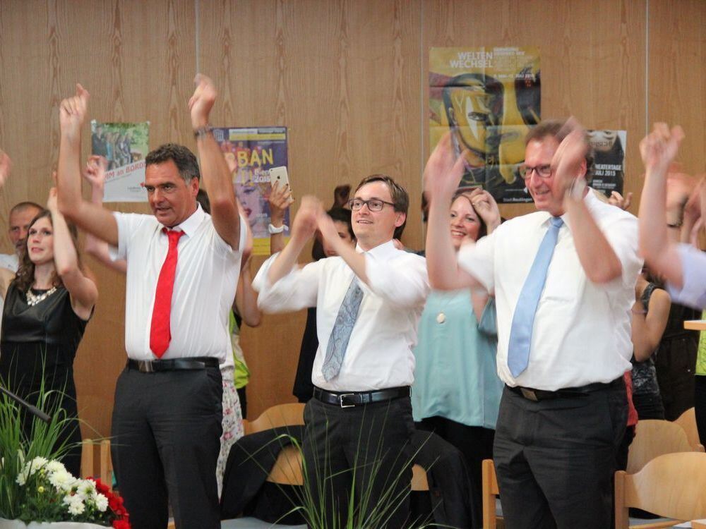 Schwungvoll gefeiert: Geschäftsführerin Hanna Pfannenschwarz, die Bürgermeister Thomas Hölsch und Steffen Heß und Landrat Joachim Walter (von links) beim »Körperzellenrock«.