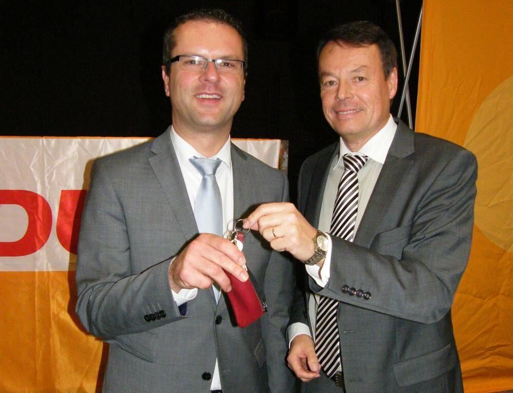 Übergabe der Schlüssel zur Kreisgeschäftsstelle von Klaus Tappeser (rechts) an Stephan Neher. FOTO: ALM