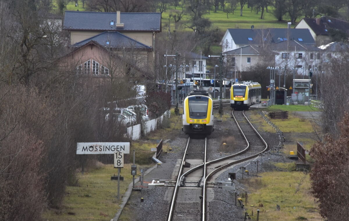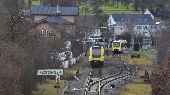 Das Mössinger Bahnhofsgelände von Osten. Rechts würde die Stadtbahnhaltestelle entstehen, links das Bahnhofsgebäude.
