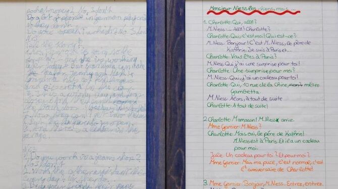 Gerahmte Schriftproben im Flur des Instituts demonstrieren die Veränderung eines Jungen mit ADHS vor, während und ein paar Jahre nach der erfolgreichen Neurofeedback-Behandlung (von links): Die Schrift wird deutlicher, ruhiger, gegliederter. GEA-FOTOS: MEY/IWA