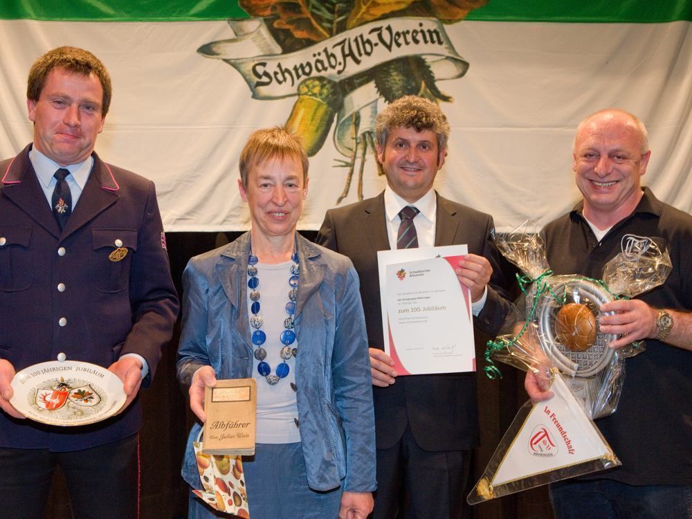 Geschenke zum Jubiläum (von links): Wolfgang Bauer (freiwillige Feuerwehr), Irene Schellhammer (Obst- und Gartenbauverein), Thomas Maier (Albvereins-Ortsgruppe Mähringen) und Uwe Keinath (TSV).