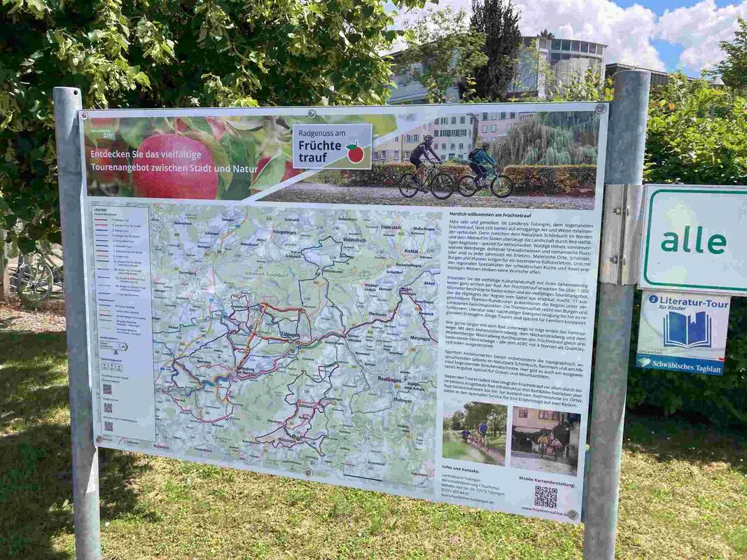 Einige der Touren sind auch speziell für Familien mit Kindern konzipiert: Die Streuobst-Tour für Kinder ist beispielsweise mit thematischen Erlebnisstationen ausgestattet. Auch Fernradwege sind auf der Tafel zu finden: Die Etappen des Neckartalradwegs, des Württemberger Weinradwegs, des Hohenzollernradwegs und der Streuobst-Radroute machen Lust auf Mehrtagestouren, sind aber auch gut als Tagestouren zu fahren. (eg)
