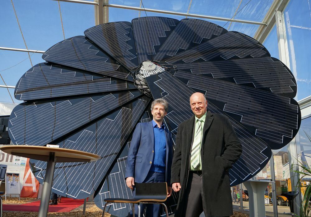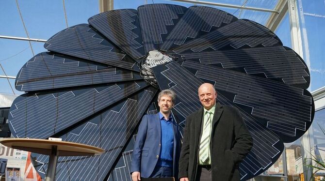 Fotovoltaikmodule müssen nicht langweilig aussehen: Tübingens OB Boris Palmer (links) und Messe-Organisator Michael Bartmann vor einer Solarblume auf dem Gelände der Messe »Für die Familie«. Diese kann der Sonne folgen, Strom für Autos und Räder liefern. FOTO: MARSCH