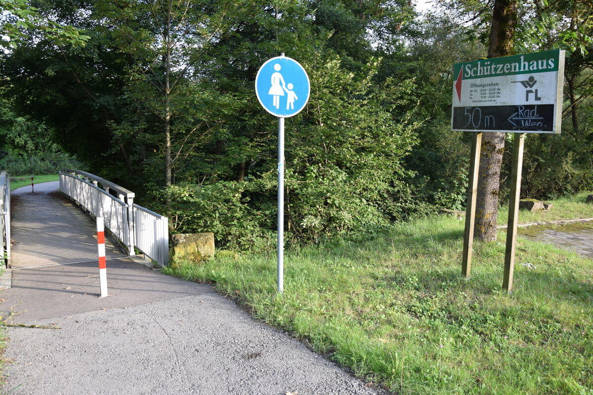Zarter Kreidehinweis auf den besseren Radweg in die Ortsmitte von Dußlingen, der beschattet entlang der Steinlach verläuft.