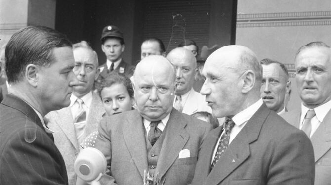 1955: Ex-Gestapomann Ludwig Griesinger wird von Oberbürgermeister Hans Gmelin vor dem Tübinger Rathaus als Heimkehrer empfangen. FOTO: GÖHNER/STADTARCHIV TÜBINGEN