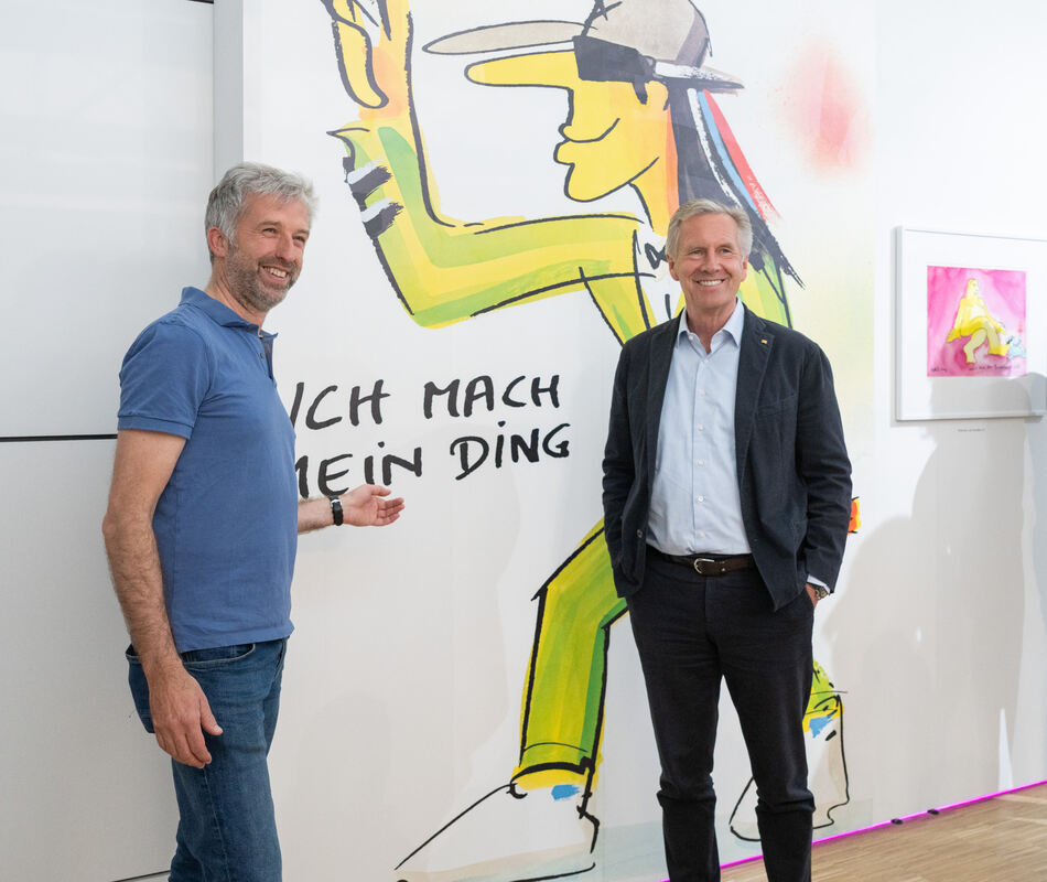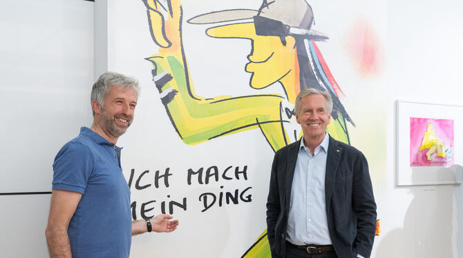 TÜBINGEN. Schnaps, Kippen, ein Hauch Erotik - und mittendrin Alt-Bundespräsident Christian Wulff (CDU). So recht zusammenpassen will das auf den ersten Blick nicht. Doch Wulff und die deutsche Rocklegende Udo Lindenberg, zu dessen Ausstellung das ehemalige Staatsoberhaupt kürzlich extra ins Neue Kunstmuseum Tübingen in Begleitung von Oberbürgermeister Boris Palmer kam, kennen sich seit Jahren. Wulff ist mit Lindenbergs Gesamtwerk gut vertraut. »Er wird nicht so kritisch hinterfragt, ob er was falsch macht - ganz im Gegensatz zu uns Politikern«, sagte Wulff bei einer Führung durch die Schau. Mit einem Blick auf eines der meterhohen Kunstwerke greift er den Text auf: »Ich mach' mein Ding - ein gutes Motto.«