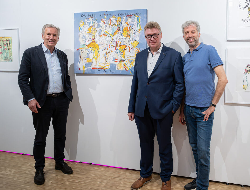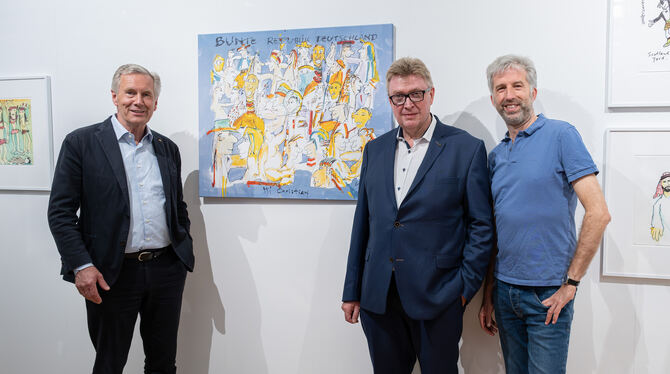 Auf eines der Ausstellungsstücke blicke Wulff hingegen fast schon wehmütig: »Menschenfamilie I«, ein künstlerischen Bekenntnis für eine bunte Republik Deutschland und signiert mit einem »Hi Christian« - ein Geschenk von Lindenberg an Wulff, zur Zeit als Leihgabe im NKT. »Das vermisse ich schon sehr in meinem Arbeitszimmer«, sagte der Alt-Bundespräsident. (GEA)