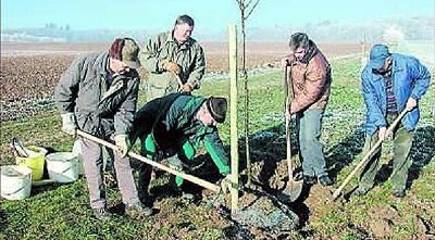 Paul Breitmaier, Jakob Hoffmann, Lutz Peter, Eckart Fritz und Gerhard Sautter (von links) langten zu und setzten den »Wildling von Einsiedel« ins winterharte Erdreich.