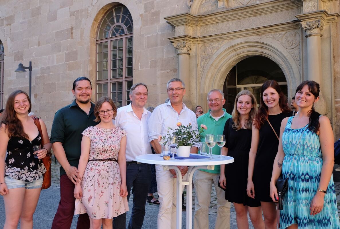 Die Herausgeber des Buches »Mathematik mit Modellen« mit einigen der beteiligten Studierenden (von links): Felicia Stahl, Daniel Bonow, Rebecca Rapp, Frank Loose, Ernst Seidl, Edgar Bierende, Celia Maurer, Sandra Müller und Janine Lehleiter. FOTO: HAAS