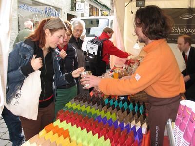 Trinkschokolade in allen Variationen bietet die Münchner Cacao-Gesellschaft: Michael Beck (rechts) lässt Besucher auch schon mal das Schokoladen-Pulver mit Chili kosten, bevor er ihnen eine Tasse mit gewürztem heißen Kakao anrührt.
