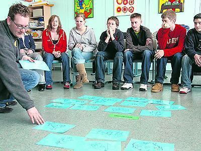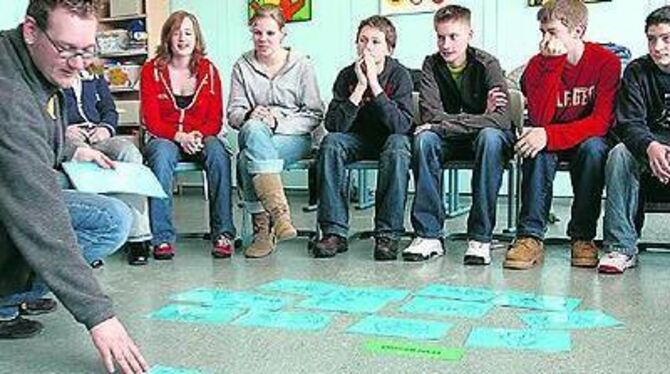 Markus Spyrka von der Aids-Hilfe bei der Arbeit mit Schülern der neunten Klasse der Graf-Eberhard-Realschule.