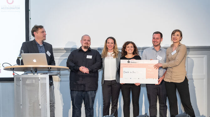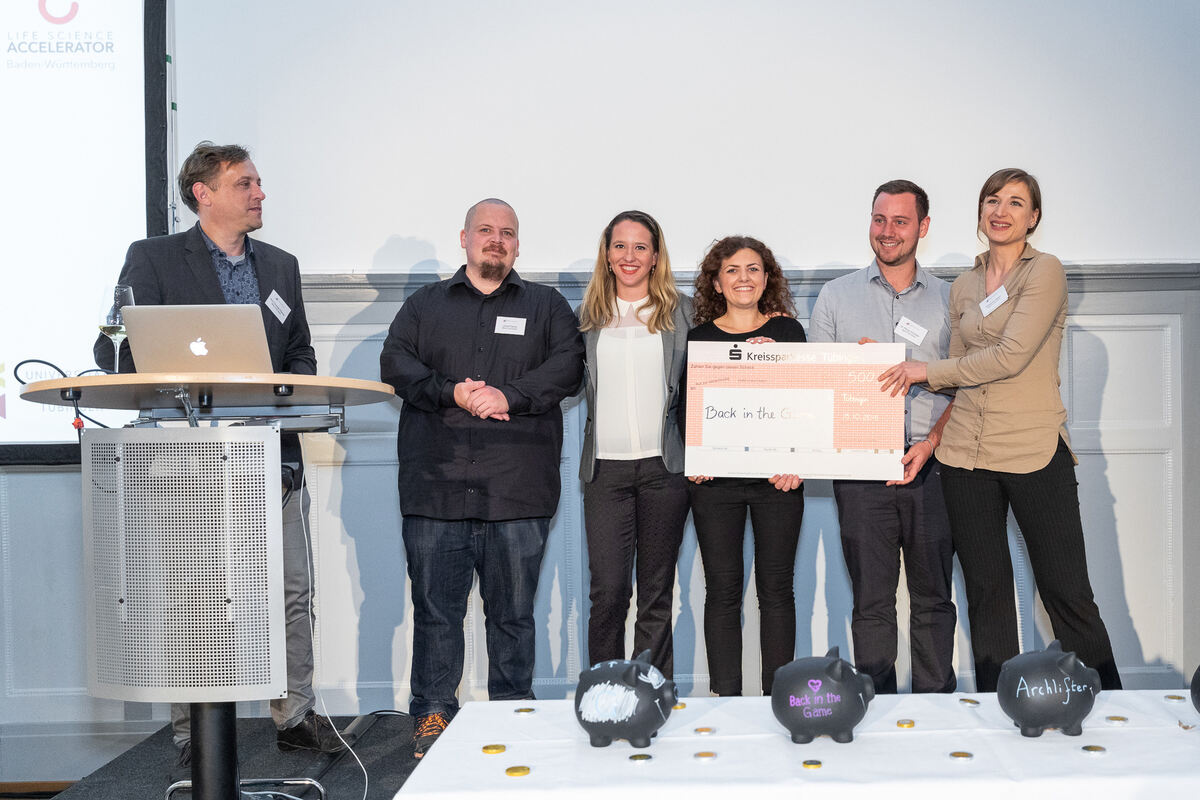 Das Gewinner-Team der diesjährigen Med-Tech Startup School: »Back in the Game« mit (von links) Professor Christian Plewnia, Jonas Paulus, Vivian Sönksen, Maria Spohr, Philipp Schröder und Katharina Stegen. FOTO: ARMIN BURKHARDT