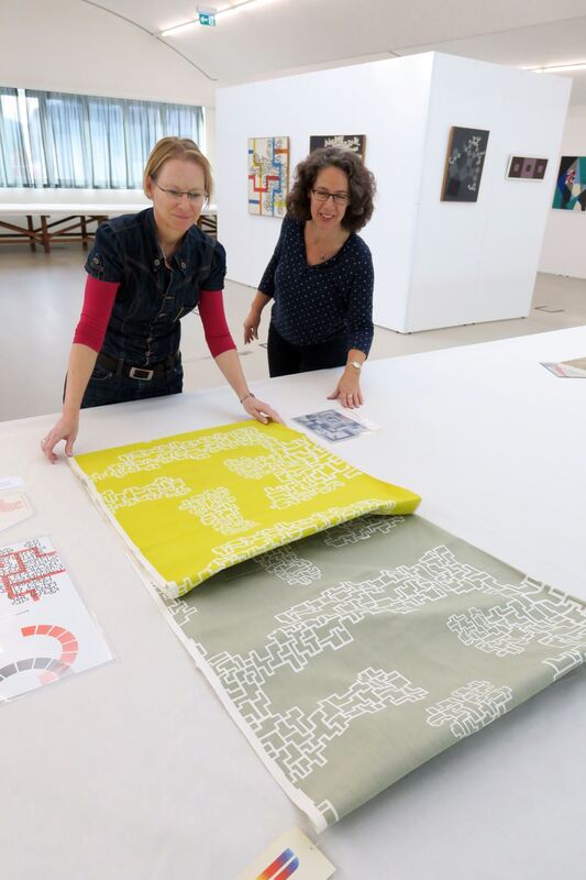 Die Macherinnen der Ausstellung »Stankowski und die Pausa« im Jahr 2017: Franziska Blum (links) und Silvia Maier mit Anton Stankowskis Textilmuster-Entwurf »Planina« in der Pausa-Tonnenhalle. FOTO: KNAUER