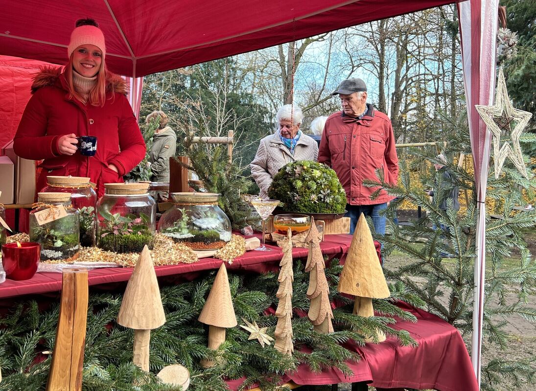 Der Fußweg zum Café war leicht matschig. Wer zum Waffelstand unterhalb wollte, musste schon aufpassen, nicht abzurutschen. Die Terracotta-Schalen am Stand von Jessica und Anica Rommel aus Dußlingen waren bereits vergriffen. Dafür gab es noch Dekoration aus Holz und selbst hergestellte Flaschengärten. In den Glasbehältern befanden sich zahlreiche Pflanzen, sorgsam arrangiert.