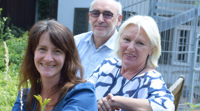 Im Alten Schulhaus in Kusterdingen arbeitet man längst kräftig vernetzt (von vorne): Leiterin der Gemeindebücherei Heike Luley, Birgit Romanowicz von SABE und Dieter Renner vom Förderverein Diakonie Härten auf der Terrasse des Hauses. FOTO: STÖHR