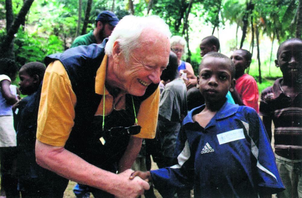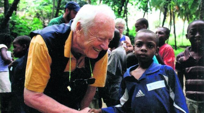 Der Tübinger Chirurg und Initiator des Hilfs-Unternehmens, Professor Bernd Domres, in diesem Sommer im humanitären Einsatz auf Haiti mit einem der Kinder, denen das siebenköpfige Team der Stiftung des Deutschen Instituts für Katastrophenmedizin in der freien Zeit Fußballtore gebaut hat. FOTO: SKM