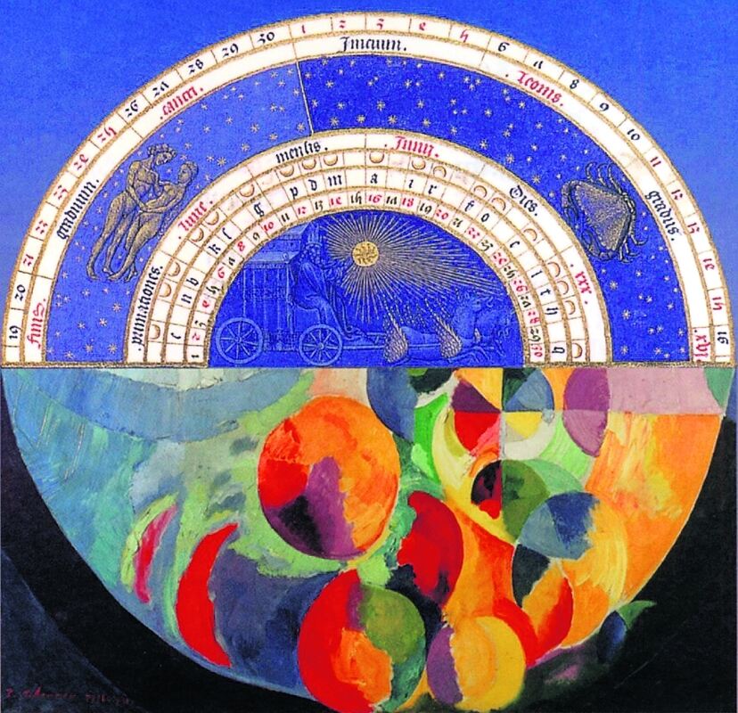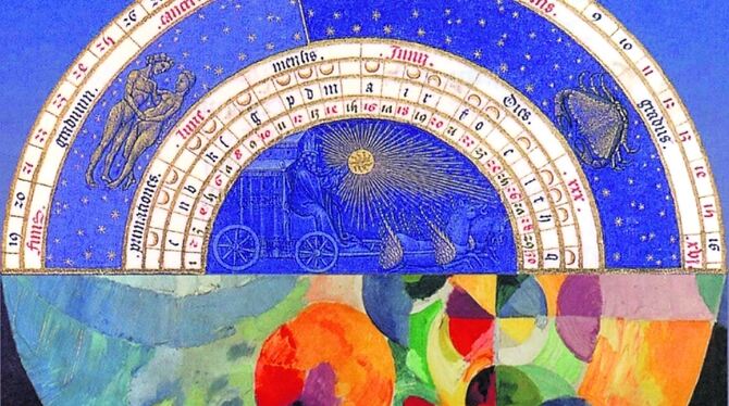 Die Zahl der von der Astrologie inspirierten Werke ist größer, als mancher denkt: Hier eine Tierkreis-Darstellung aus dem populären Stundenbuch »Très Riches Heures« (15. Jahrhundert) in einer Kombination mit moderner Malerei von Robert Delaunay. FOTO: VERLAG