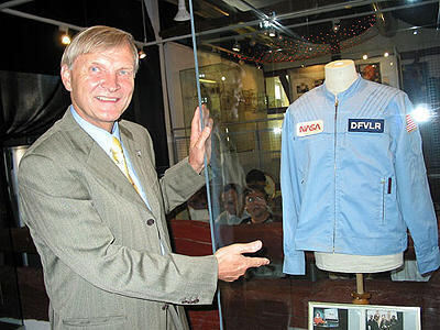 Ernst Messerschmid und sein Astronautenteam überreichten dem Tailheimer Grafiker Hermann Fritz in den 80er Jahren eine ihrer Weltraum-Jacken. Am Sonntag kam Messerschmid zur Ausstellungseröffnung und fand die Jacke in einer Glasvitrine wieder.